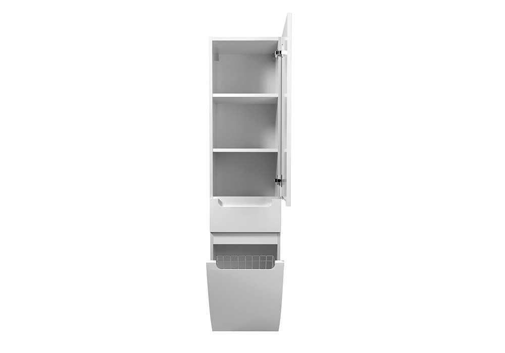 Пенал оснащений дверцятами правосторонніми без можливості перенавішування, висувним ящиком і відкидним кошиком для білизни, що забезпечує зручний доступ до предметів, що зберігаються. Корпус виготовлений з 16 мм ДСП фарбованої, забезпечуючи міцність та довговічність конструкції. Фасад виконаний з 19 мм вологостійкого фарбованого MDF Kronospan, що надає пеналу вишуканого вигляду.