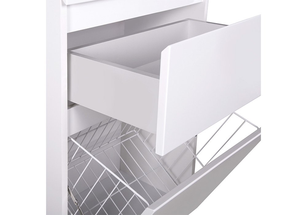 Виготовлений з вологостійкого МДФ та покритий білим глянцевим лаком, пенал Фокус П-55к Мойдодир не лише виглядає стильно, але й забезпечує довговічність та легкість у догляді. Він оснащений розпашними дверцятами, висувним ящиком та відкидним кошиком для білизни, що забезпечує зручний доступ до збережених предметів.