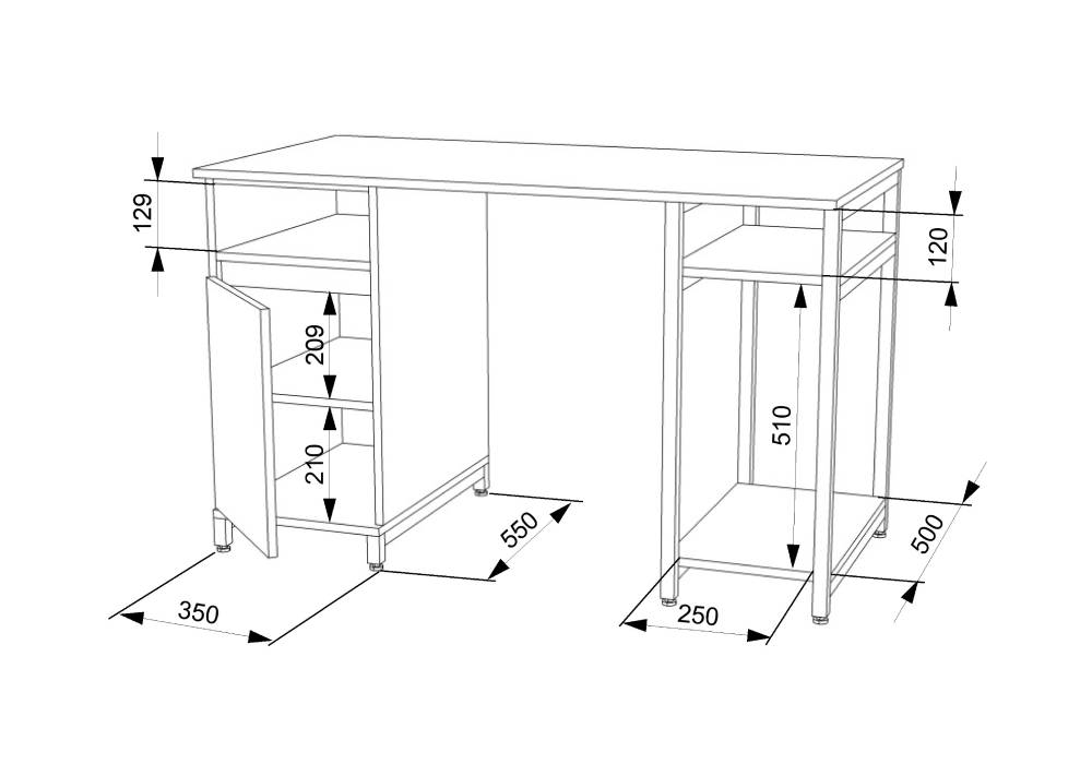 Металеві ніжки столу розміром 25х25 мм мають хорошу стійкість і представлені в декількох колірних рішеннях. Збоку столу є закрита тумба з полицями.