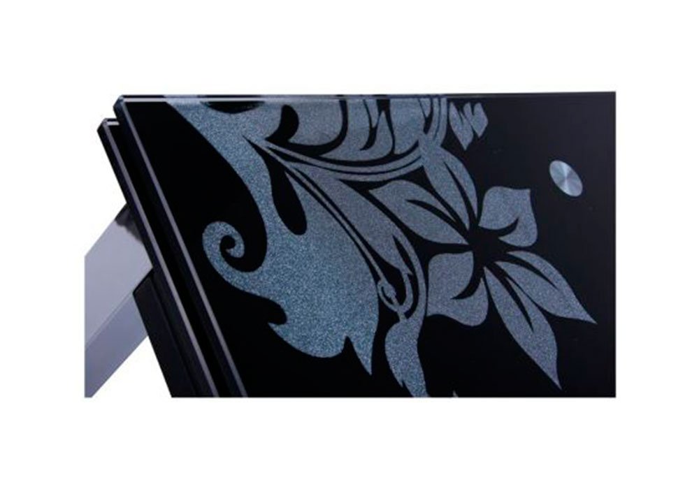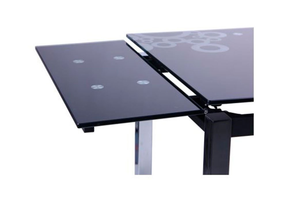 Розсувний обідній стіл "Глорія" , завдяки скляній стільниці з малюнком , додасть трохи святкового настрою на вашу кухню, вітальню, їдальню. Також дана модель підійде як частина меблевого гарнітура для кафе чи ресторану . Стіл поєднує в собі чорну стільницю з розжареного скла і металеві хромовані ніжки. Гартоване скло стійке до високих температур, вологи та механічних пошкоджень.
