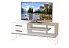 Тумба під телевізор "332" Тиса Меблі характеризується оригінальної конструкцією з двох висувних шухлядок і відкритого відділення з полицею. Для додаткової стійкості поличка кріпиться на металевої циліндричної підставці, що надає виробу оригінальний і сучасний вигляд, Елегантності додають витончені ніжки тумби. Всі деталі з'єднані якісною фурнітурою. Фасади доповнені кромкою ПВХ товщиною 2 мм. На дверцятах встановлено ручки чорного матового відтінку шириною 192 мм.